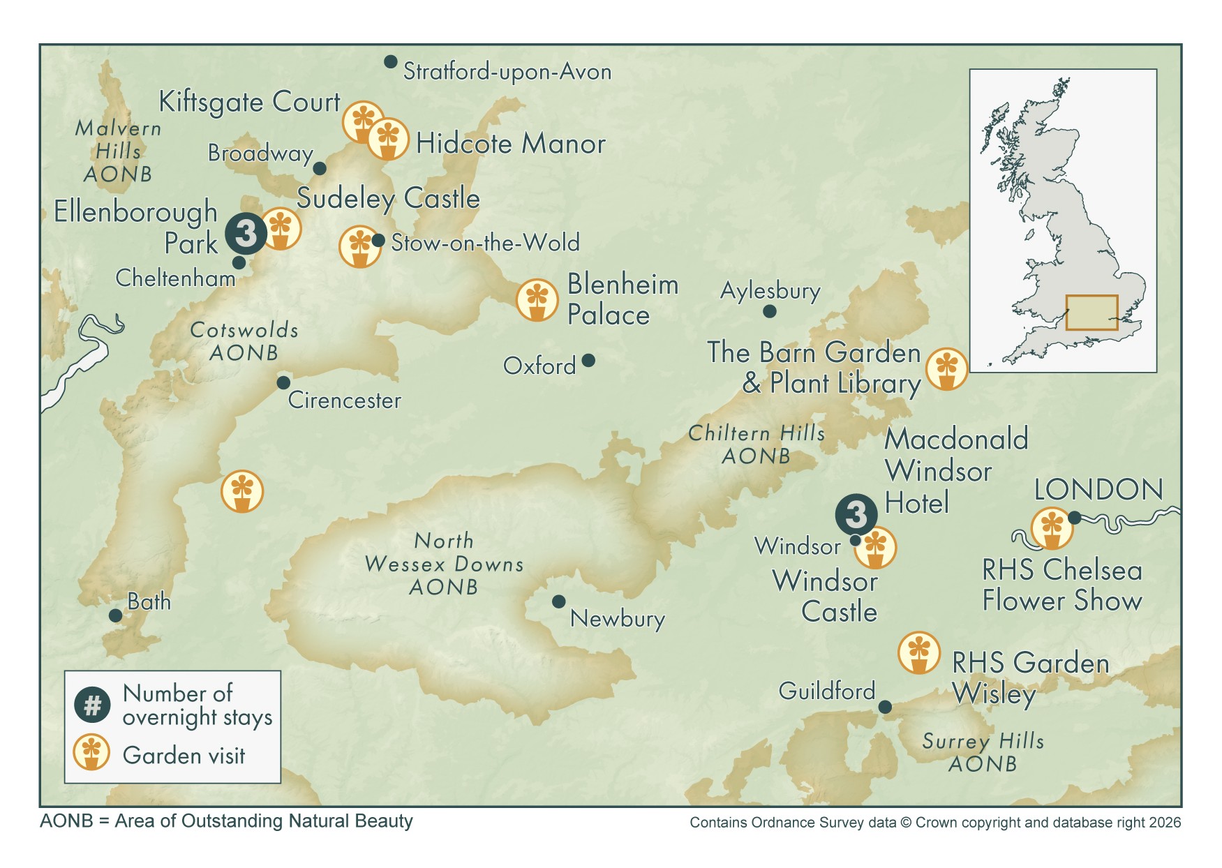 This fabulous tour combines the world-famous RHS Chelsea Flower Show on members-only day, Windsor Castle, RHS Wisley, Blenheim Palace and Sudeley Castle with a selection of the finest gardens in the Cotswolds. On this tour you can expect majestic historic residences, wonderful scenery, superb hotels and inspirational gardens.